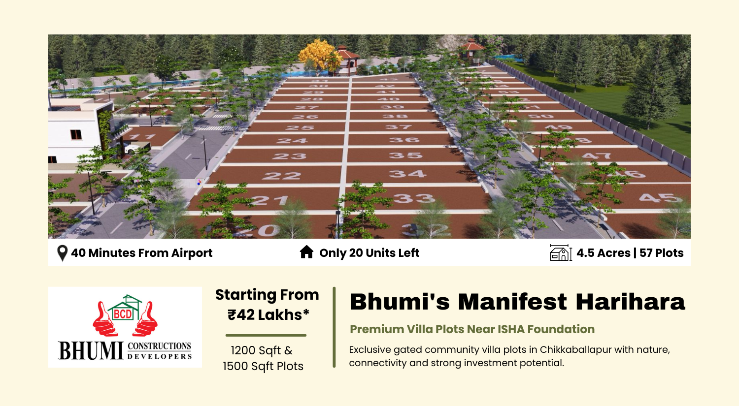 Bhumi's Manifest Harihara offers 57 exclusive residential plots spread across 4.5 acres. With only 20 units remaining, this is a limited opportunity for premium villa plot ownership.