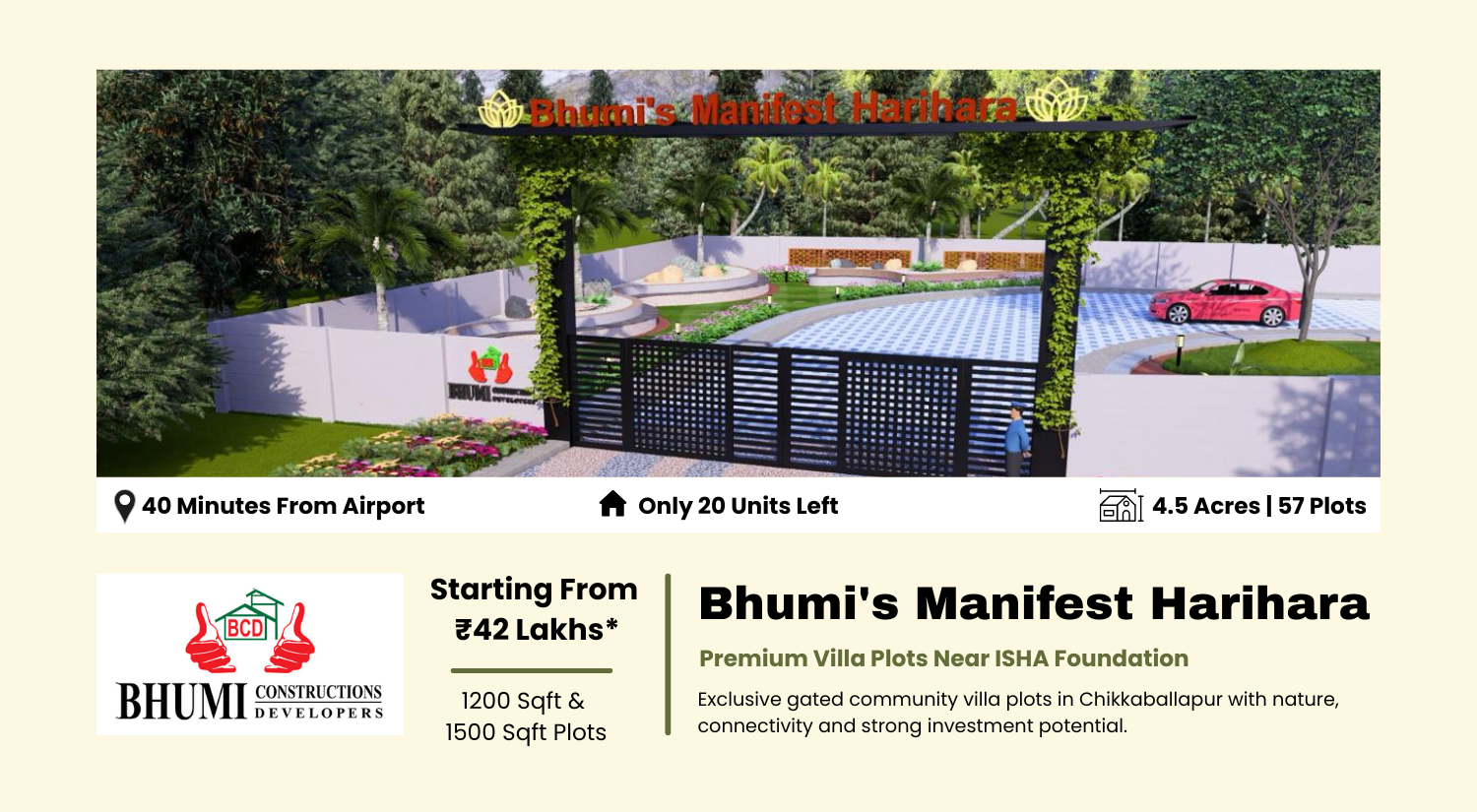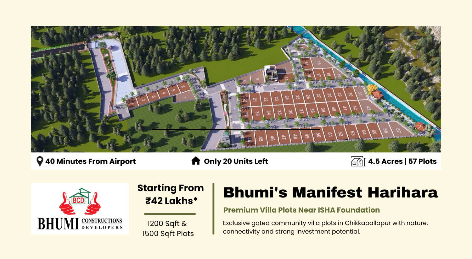 Bhumi's Manifest Harihara is a thoughtfully designed premium villa plot community located near ISHA Foundation in Chikkaballapur, one of the most promising growth corridors of North Bangalore. Spread across 4.5 acres, the project offers 57 exclusive residential plots in a secure gated layout surrounded by greenery and peaceful surroundings. With proximity to Bangalore Hyderabad Highway, Devanahalli growth corridor and Kempegowda International Airport, the project offers excellent connectivity and future appreciation potential. Whether you are planning to build your dream villa or looking for a smart real estate investment near Bangalore, Bhumi's Manifest Harihara offers the perfect combination of nature, infrastructure and long-term value.